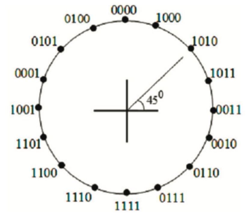 Цифровые сигналы (2) формируются, отображая двоичных символов () в символы комплексных огибающих «созвездия» [2]. На рис. 1 приведен пример сигнального «созвездия» цифровых сигналов ФМ-16, даны правила отображения двоичных символов в символы комплексных огибающих «созвездий».