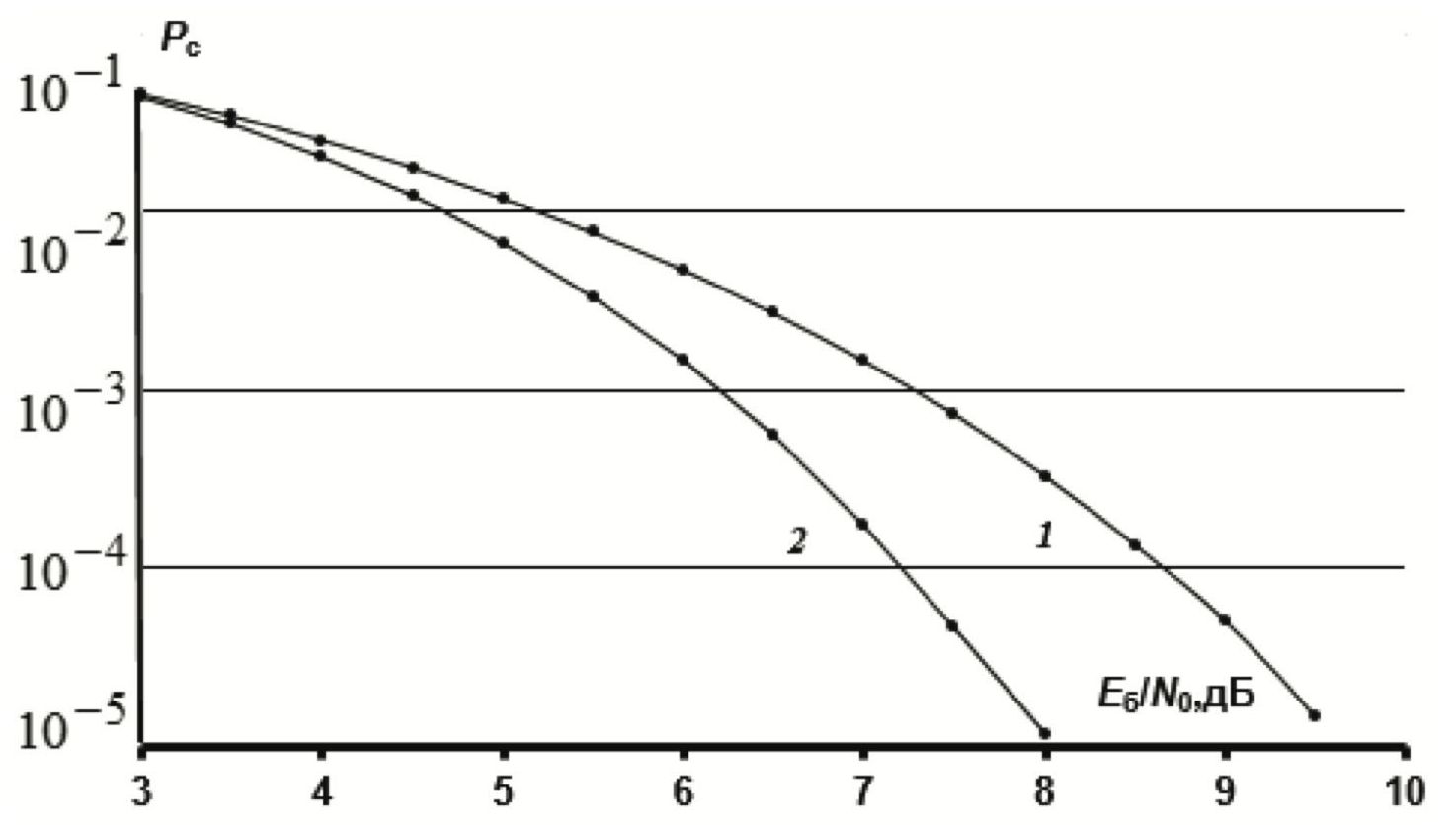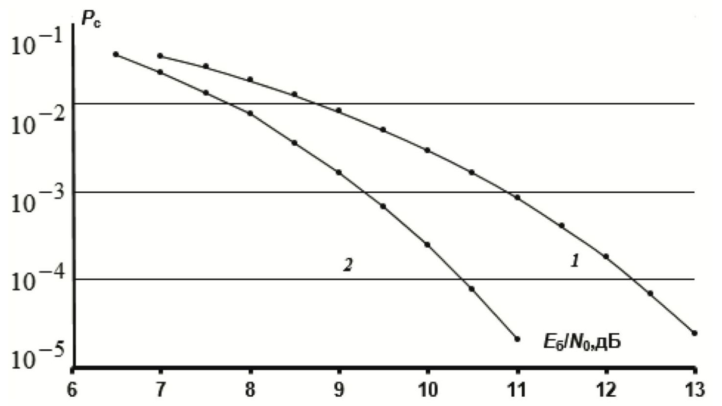 Рис. 3. Вероятности ошибки при приеме сигнальной конструкции на основе сигналов ФМ-8: 1 — без кодирования; 2 — с использованием корректирующего кода в поле .