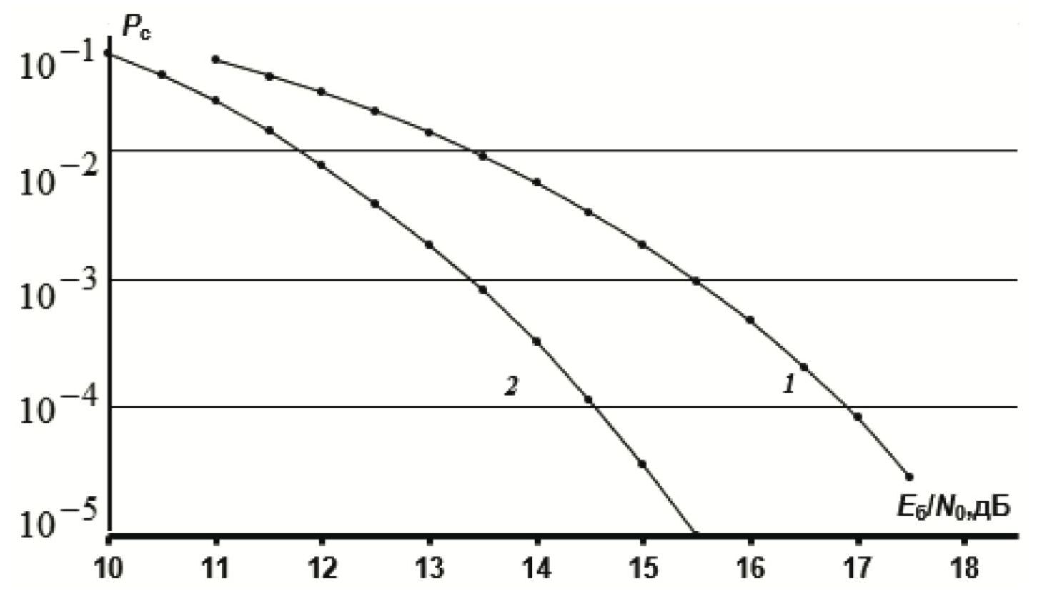 Рис. 4. Вероятности ошибки при приеме сигнальной конструкции на основе сигналов ФМ-16: 1 — без кодирования; 2 — с использованием корректирующего кода в поле .