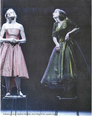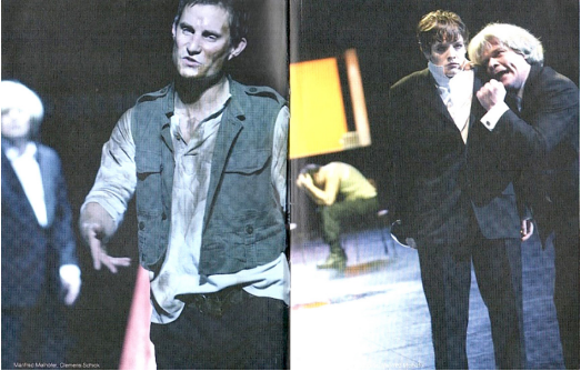 Иное смысловое наполнение цвету — темному цвету, темноте — придаётся в сценографии драматического театра Ганновера (Германия) в спектаклях, интерпретирующих образ Медеи в современных постановках пьесы Т. Ланоя «Mamma Medea» (2003) и трагедии Грильпарцера «Золотое руно» (2019). Успех пьесы бельгийского драматурга Т. Ланоя на немецкой сцене можно объяснить прежде всего тем, что «Mamma Medea» оказалась на пике общественных и культурных проблем Германии на рубеже XX—XXI веков, связанных как с долгожданным объединением, так и с миграционной политикой в стране. Режиссер Себастьян Нюблинг, как отмечали критики, «жёстко» обошелся с сюжетом древнего мифа, поскольку в силу своей природы каждому мифу свойственна «чудовищная» выносливость и стабильность смысловой парадигмы, поэтому его можно трансформировать в контексте любых современных проблем. Миф подобен «чёрному ящику», где перемешано и высокое, и низкое. По замыслу режиссера такой «чёрный ящик» был выстроен декораторами спектакля, и в нем возвышенные и гордые образы мифологической древности преображаются в заурядные, тривиальны фигуры театра марионеток. Сценические ландшафты двух частей спектакля контрастны не только по названию («Zu Hause/ in der Fremde» («Дома/ на чужбине») и «In der Frermde/ zu Hause»(«На чужбине/ дома»)). События в первой части спектакля происходили в полутьме, а световые эффекты прожекторов создавали впечатление погружения в тайную глубь столетий, переносили зрителей и читателей в далёкий таинственный мир, где обитают прекрасные, цельные, естественные существа, что подчеркивалось элегантностью нарядов: призрачным мерцанием женских платьев и аристократизмом мужских костюмов, что создавало явный диссонанс с неопрятной, грязной одеждой аргонавтов — Ясона и его свиты — ловцов легкой наживы, ощущающих себя «культуртрегерами», как это показано на рисунках 1 и 2.