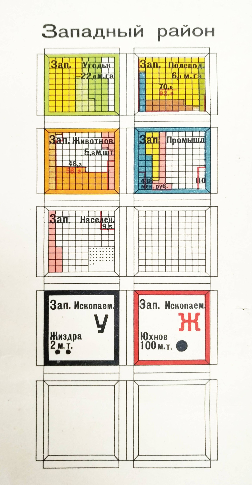 При том что репертуар картографических пособий довольно разнообразен, их объединяет ряд общих характеристик. Карты этого периода, как правило, не перегружены сведениями и номенклатурой и легко читаются. Одной из особенностей оформления карт является миметический прием для значков легенд. Например, разные виды производства обозначены натуралистичными изображениями нефтяной вышки, мешка с мукой, тюков хлопка, сведения о температуре и осадках — изображениями термометров и колб. Таким значкам сопутствует прием масштабирования, который выражается в том, что разные объемы какого-либо продукта или масштабы производства визуализируются значками разного размера. На некоторых картах стремление к натуралистичности и детализации значков приводит к снижению читаемости — например, на карте Орловской губернии виды производства сложно дифференцировать [Фомин 1927]. Использование этого миметического приема можно интерпретировать не только как желание усилить наглядность и упростить чтение карты, но и как стремление к репрезентации реальности. Такой способ визуализации постепенно сменяется на более условный.