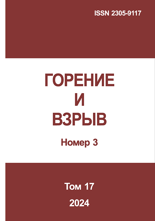 Изучено влияние 11-диэтилферроцена (ДАФ-2) в индивидуальном виде и в сочетании с сажей и углеродными нанотрубками (УНТ) на горение модельного образца на основе неактивного связующего 12,2% поливинилбутираля (ПВБ), пластифицированного 15,8% дибутилфталатом (ДБФ) и 70% перхлората аммония, содержащего 1,4% фторопласта-4 и 0,6% технологических добавок. Заряды топлива изготавливались с использованием вальцевания и проходного прессования. Скорость горения определяли в приборе постоянного давления в атмосфере азота на бронированных шашках диаметром 6 мм и высотой 15 мм. Эффективность действия добавок оценивали величиной Z = Uдоб/U0, где Uдоб — скорость горения топлива с соответствующей добавкой; U0 — скорость горения топлива без добавок. Кроме того, оценивали влияние добавок на параметр ν в законе скорости горения U = Bν. Исследованы структура и элементный состав поверхности горения погашенных образцов. Установлено, что при горении образцов с катализатором и УНТ на поверхности горения образуется каркас, на котором происходит существенное накопление частиц катализатора, УНТ и фторопласта. Таким образом, катализ горения происходит по такому же механизму, как и для баллиститных порохов и различных взрывчатых веществ (ВВ), содержащих нитрогруппы. Поэтому можно считать, что механизм катализа энергетических веществ является единым.