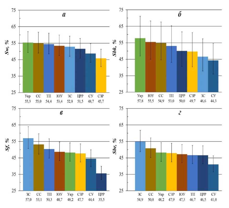 Рис. 3. Ранжирование регионов по величине ССВ в разных фракциях надземной фитомассы; а, б, в, г – соответственно ССВ в древесине ствола, коре ствола, хвое и ветвях, %. Обозначения регионов в табл. 2. Цифры вдоль оси абсцисс показывают значения ССВ для соответствующих регионов