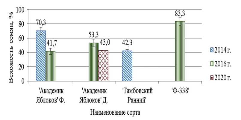 Грунтовая всхожесть семян фундука варьировала от 41,7±4,41 до 83,3±5,07 %, наибольшее значение отмечено у формы 'Ф-338' (рис. 3). У образцов 'Академик Яблоков' всхожесть в среднем составила 52,0±6,61 %, самое высокое значение зафиксировано в 2014 году. Растения с пурпурными листьями имелись среди сеянцев не только пурпурнолистных сортов, но и зелёнолистного 'Тамбовский Ранний', поскольку их маточные растения произрастают в непосредственной близости друг от друга и переопыляются. Среди сеянцев, полученных в результате посева 2016 года, у 'Академик Яблоков' было выявлено 45,5 % растений с пурпурными листьями, среди сеянцев 'Ф-338' – 39,1 %. Важное значение имеет предпосевная обработка плодов для отпугивания грызунов, хотя и она не гарантирует полную защиту. Так, посевы осени 2015 года были полностью уничтожены, несмотря на обработку керосином. Более успешными были посевы, проведённые перед наступлением морозов, поскольку промерзание верхнего слоя почвы обеспечило механическую защиту от грызунов.