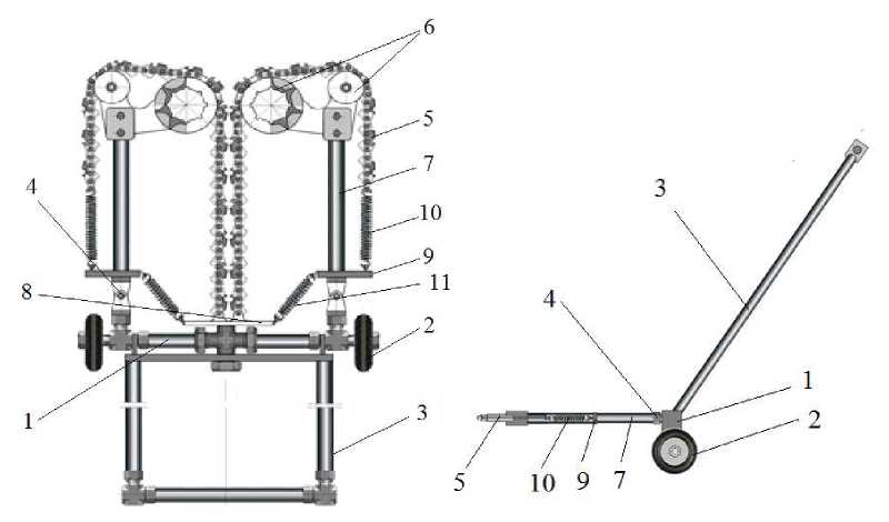 Fig. 3. Mobile device for tree ringing: 1 – frame, 2 – running wheels, 3 – U-shaped guide, 4 – hinges, 5 – saw chains, 6 – sprockets, 7 – ties, 8 – central bar, 9 – side bars, 10, 11 – springs
