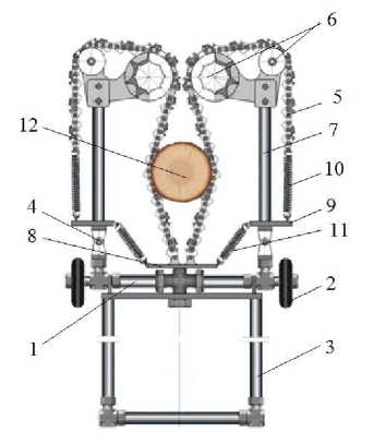 Fig. 4. Interaction of the mobile device for tree ringing with a tree to be removed: 1 – frame, 2 – running wheels, 3 – U-shaped guide, 4 – hinges, 5 – saw chains, 6 – sprockets, 7 – ties, 8 – central bar, 9 – side bars, 10, 11 – springs, 12 – tree