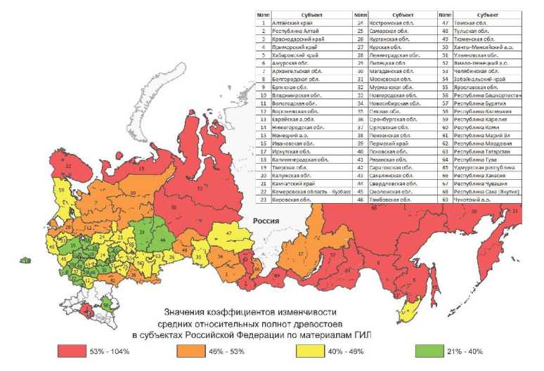 - В целом по обобщённым совокупностям средневзвешенных относительных полнот древостоев по площади в 69 субъектах РФ изменчивость принимает значение 47,5 % (21,6–103,9 %) по материалам ГИЛ и 27,1 % (2,4–30,9 %) по данным ГЛР.