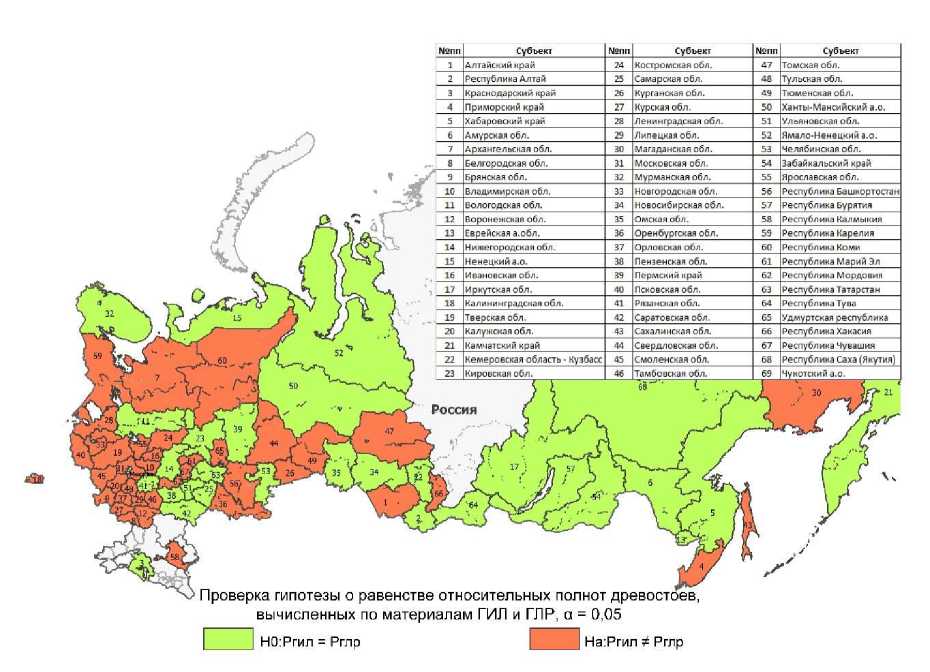 - Существенность различия относительных полнот по данным ГИЛ и ГЛР приведена по субъектам РФ на двух уровнях значимости. Установлено, что средние относительные полноты в 30 регионах существенно не различаются на уровне значимости α = 0,05, а в остальных 39 субъектах РФ различия существенны.