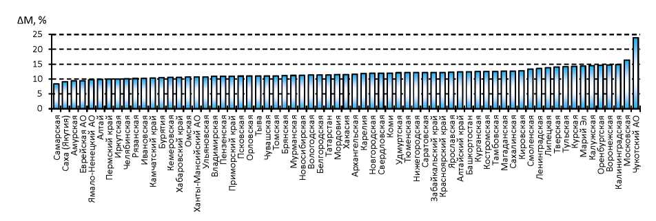Средний запас на 1 га, вычисленный методом объёмных таблиц, по большинству субъектов превышает на 10–15 % по сравнению с запасом, ограниченным по полноте до 1,0, максимальные превышения 23,9 % в Чукотском АО и 16,3 % в Московской области, наименьшие – 8,3 и 9,1 % (Самарская область и Республика Саха (Якутия), в среднем (средневзвешенное от площади) – 10,9 % (рис. 6).