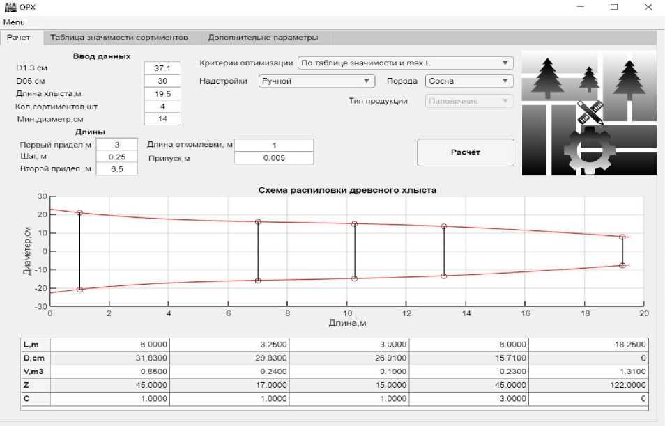Шаг 3 – обработка и вывод результатов. Вывод схемы раскроя хлыста, полученного в результате работы программы оптимизации, производится в соответствии с выбранным дополнительным критерием (максимизация по суммарному объёму сортиментов или по длине пиловочной зоны). На основании данных выбранной схемы раскроя производится построение графиков и вывод параметров сортиментов: диаметров в верхнем и нижнем отрезе, длины, сорта, объёма, значимости в заказе. В программе существует возможность сохранения полученных данных по сортиментам и расчётных параметров раскраиваемого хлыста (объём, коэффициент формы, сбег по длине) в таблице Excel.