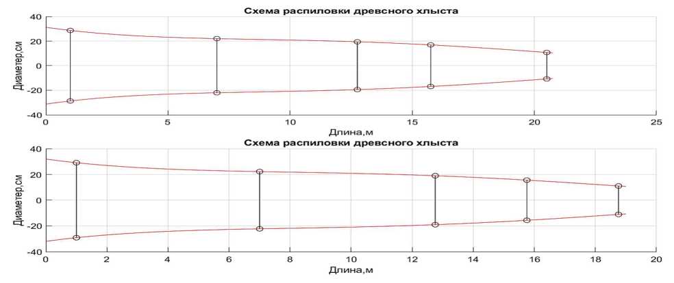 Результаты и их обсуждение. На приведённой программе оптимизации раскроя было выполнено имитационное моделирование раскряжёвки 20 хлыстов с параметрами, представленными в таблице в ручном режиме. Моделирование выполнено двумя способами в соответствии с выбранным дополнительным критерием оптимизации. Припуск по ширине пропила был принят 2 см, а вид готовой продукции – пиловочные брёвна. Результаты имитационного моделирования по дополнительным критериям максимизации суммарного объёма сортиментов (первый способ) и максимизации по длине пиловочной зоны (второй способ) представлены на рис. 3.