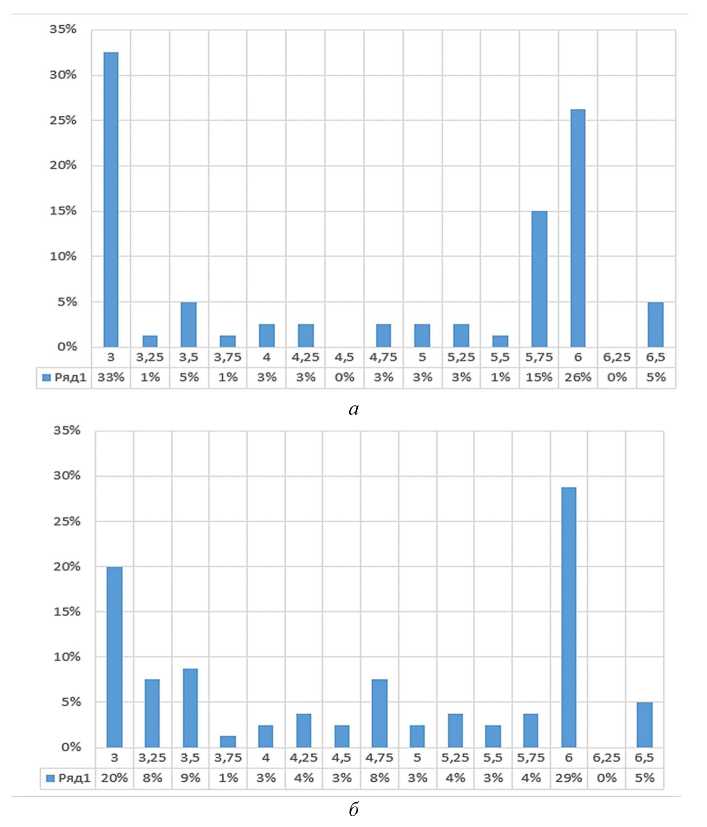 Рис. 3. Результаты моделирования раскряжёвки хлыста для ручного режима при максимизации суммарного объёма сортиментов (а) и максимизации по длине пиловочной зоны (б)