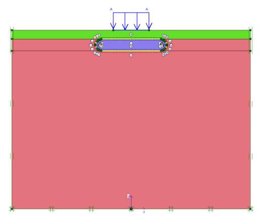 В задачи входило исследование влияния толщины и ширины геосинтетических оболочек на вертикальную осадку покрытия под колесом расчётного автомобиля и на максимальные растягивающие напряжения в геосинтетических оболочках.