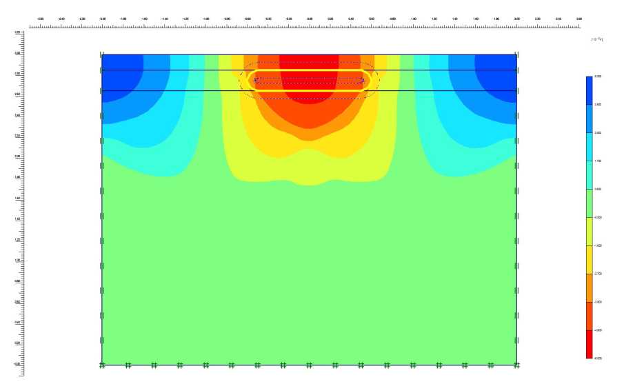 Рис. 5. Распределение вертикальных перемещений для конструкции дорожной одежды с геосинтетической оболочкой толщиной 0,2 м и шириной 1,2 м