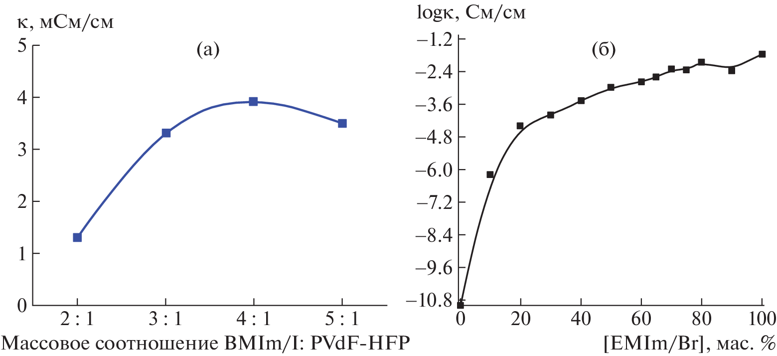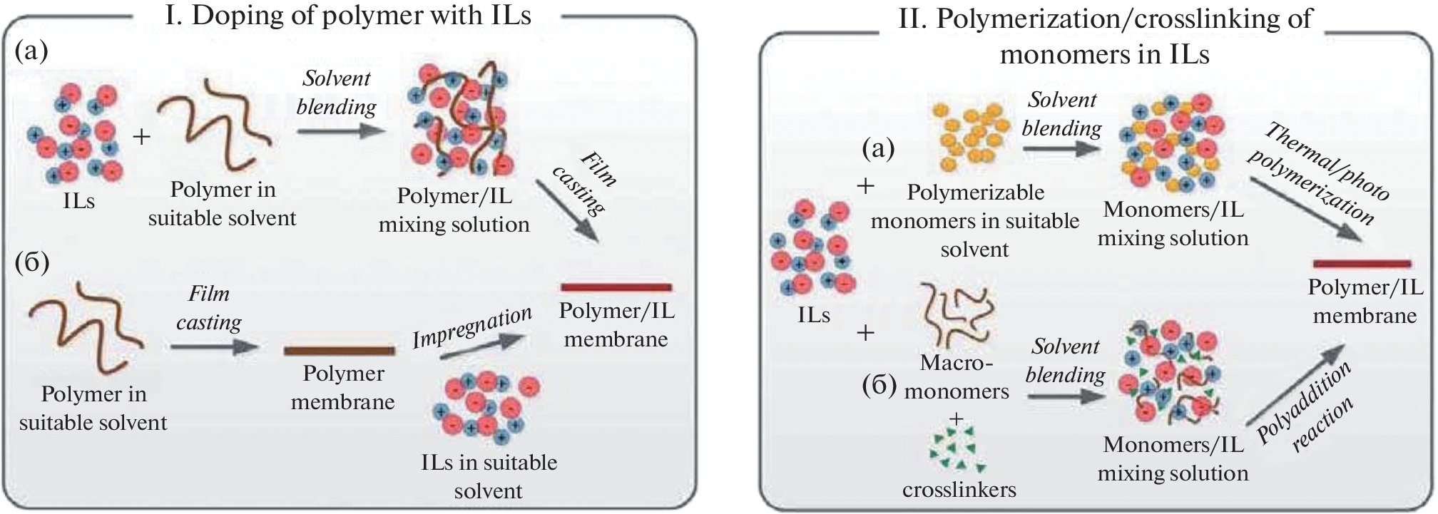 Ionic liquids, salts with melting temperature below 100°C, have continuously attracted research interest. Introduction of ionic liquids in a polymer matrix affords polymer electrolytes exhibiting extremely high electroconductivity and electrochemical stability, membranes on their basis possessing good mechanical properties. Diversity of the polymers/copolymers suitable as the matrix as well as practically unlimited variety of ionic liquids (obtained via variation of the anion-cation composition and additional modification of the ions chemical structure) have afforded the polymer electrolytes with a wide range of the physico-chemical properties. In this study, the attention has been primarily focused on the results published over the recent decades and related to investigation of electrolytes for electrochemical devices, in which the membranes based on polybenzimidazole (meta-PBI), the poly(vinylidene fluoride-со-hexafluoropropylene) (PVdF-HFP) copolymer, and ammonium or imidazolium ionic liquids have been used. Various types of polymer electrolytes differing in the composition and the application range have been considered in this study: polymer + ionic liquid, polymer + ionic liquid + acid, and polymer + ionic liquid + lithium/sodium salt. Moreover, the influence of the fillers, introduced in the above-said polymer electrolytes to improve the properties and resolve the issue of the ionic liquid retention in the membrane, has been discussed. This report presents vast data sets (tables) on the electroconductivity and thermal stability of more than 100 polymer electrolytes, which are demanded by the broad journal audience.