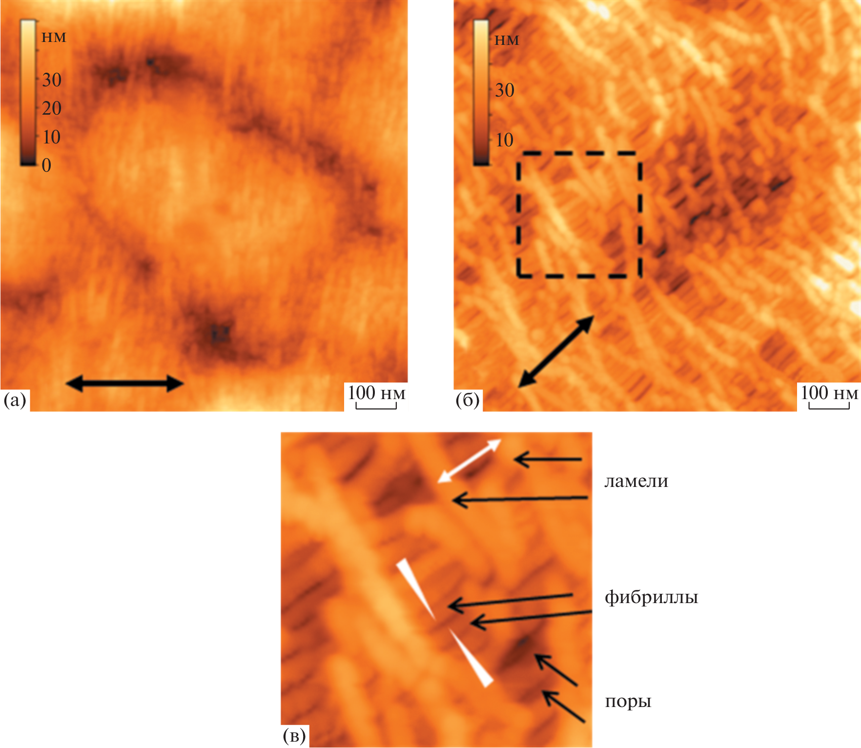 На основе пленок ПП, деформируемых в растворах ПВС по механизму крейзинга, получены новые полимер-полимерные нанокомпозиты. Методами АСМ, ДСК, гравиметрии, механических испытаний, измерения краевых углов смачивания и объемной пористости исследованы механизм деформации ПП в растворах ПВС, структура, состав, теплофизические свойства и смачиваемость композитов. Cтепень растяжения ПП и концентрация ПВС в растворе позволяют контролировать состав нанокомпозитов. Содержание ПВС может достигать 45 мас. % при степени вытяжки ПП 300%. После удаления летучей жидкой среды ПВС кристаллизуется в затрудненном пространстве мезопористой матрицы ПП с понижением степени кристалличности до 12‒14%. Введение гидрофильного компонента приводит к улучшению смачивания ПП, и краевой угол снижается с 98° для исходного ПП до 42° для композита. Гидрофилизацию с использованием явления крейзинга можно рассматривать как способ модификации, переработки и вторичного использования крупнотоннажного полимера.