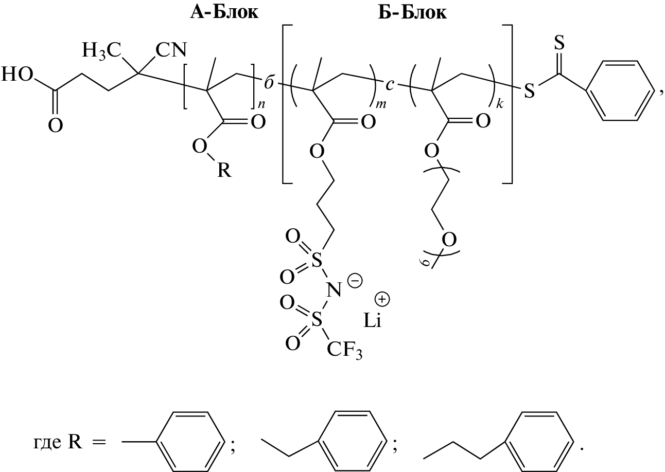 A series of novel anionic block copolymers, in which the neutral block is formed by 2-phenylethyl methacrylate (PEM) and the ionic block is prepared via statistical copolymerization of lithium 1-[3-(methacryloyloxy)-propylsulfonyl]-1-(trifluoromethanesulfonyl)imide (LiM) and methyl ether of poly(ethylene glycol) methacrylate (PEGM) have been synthesized. The effects of chemical structure, composition, and molecular mass of the blocks on ionic conductivity and thermal properties of the poly[PEM–block–(LiM–stat–PEGM)] block copolymers have been investigated. It has been found by means of small-angle X-ray scattering that the introduction of a small fraction of the lithium-containing units (~7 mol %) in the structure of neutral poly[PEM–block–PEGM] copolymer leads to microphase separation and ordering of the system. Combined small-angle X-ray scattering and atomic force microscopy data have evidenced the formation of lamellar structure with the interplanar distance of d ~ 28 nm.