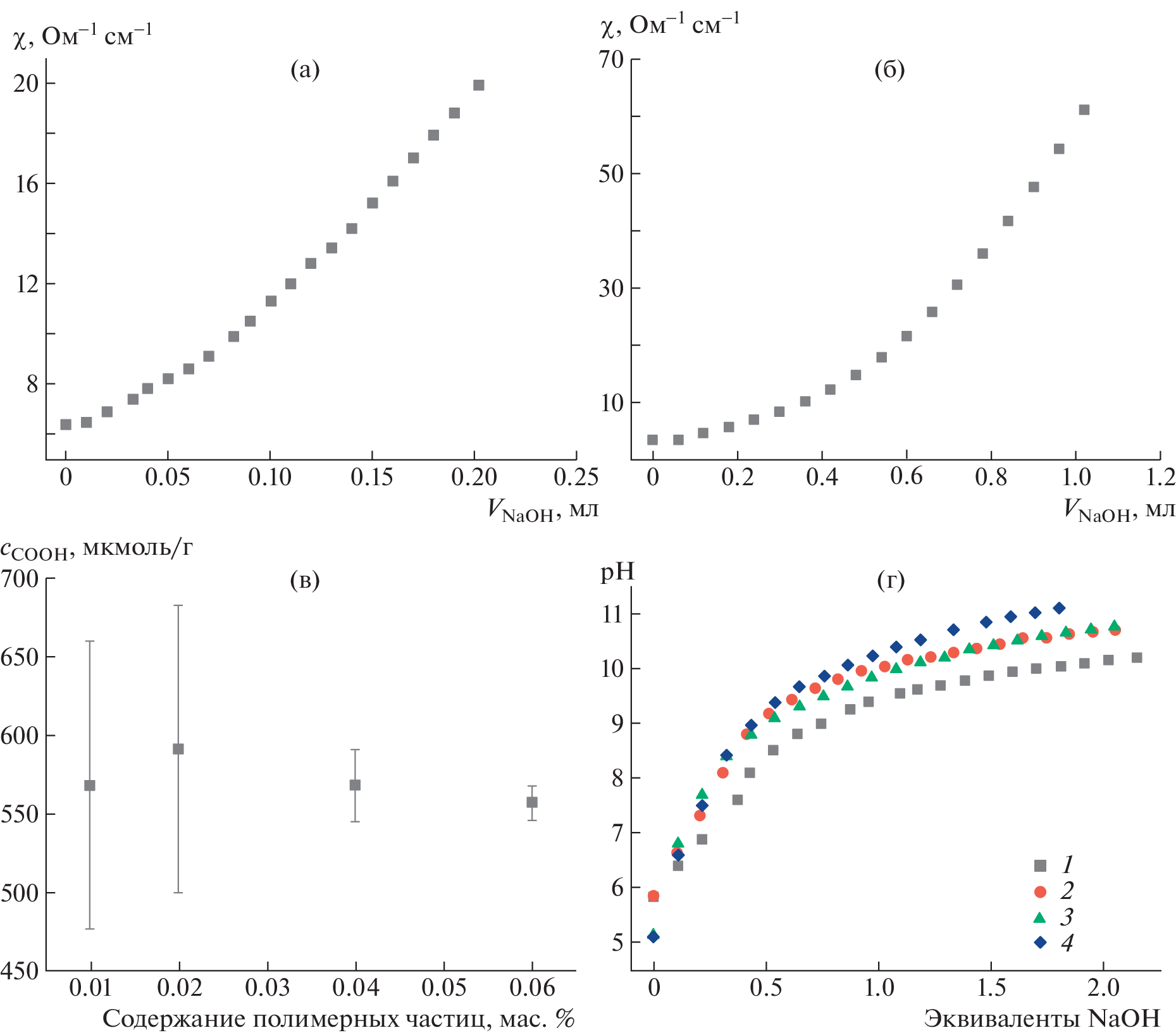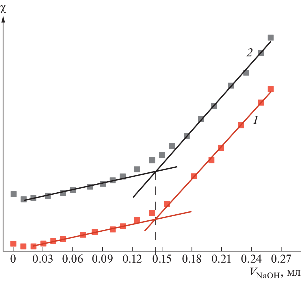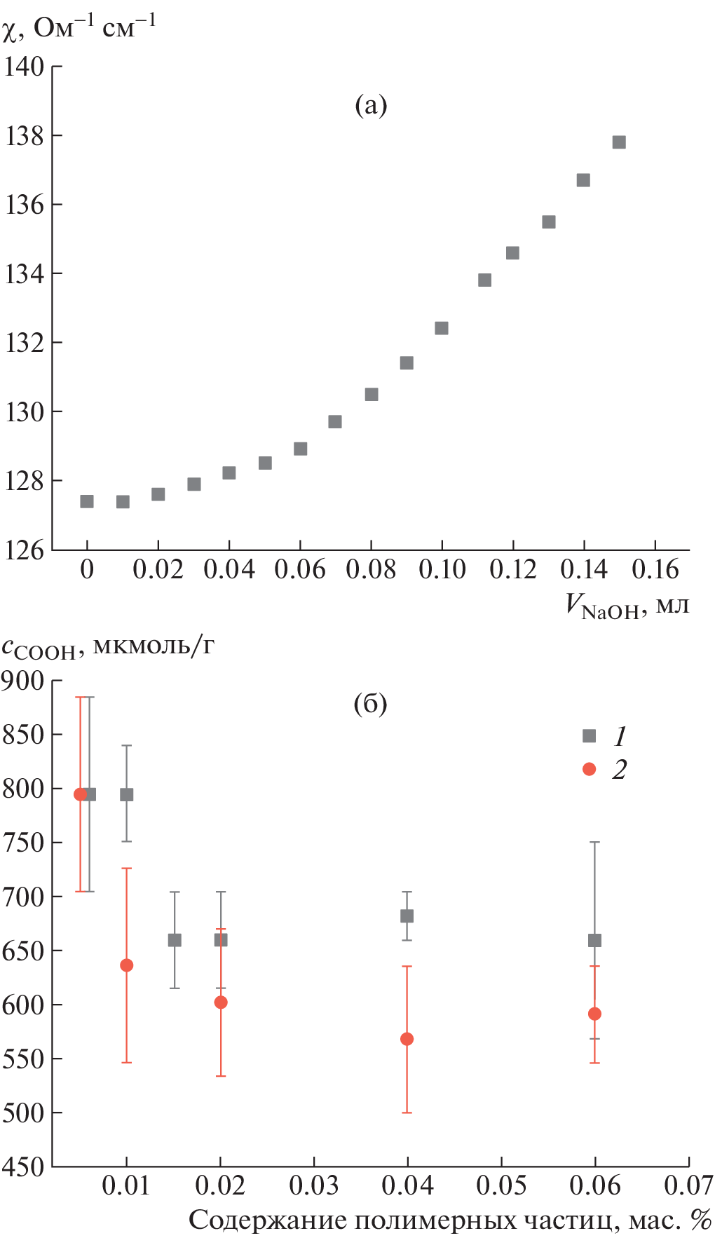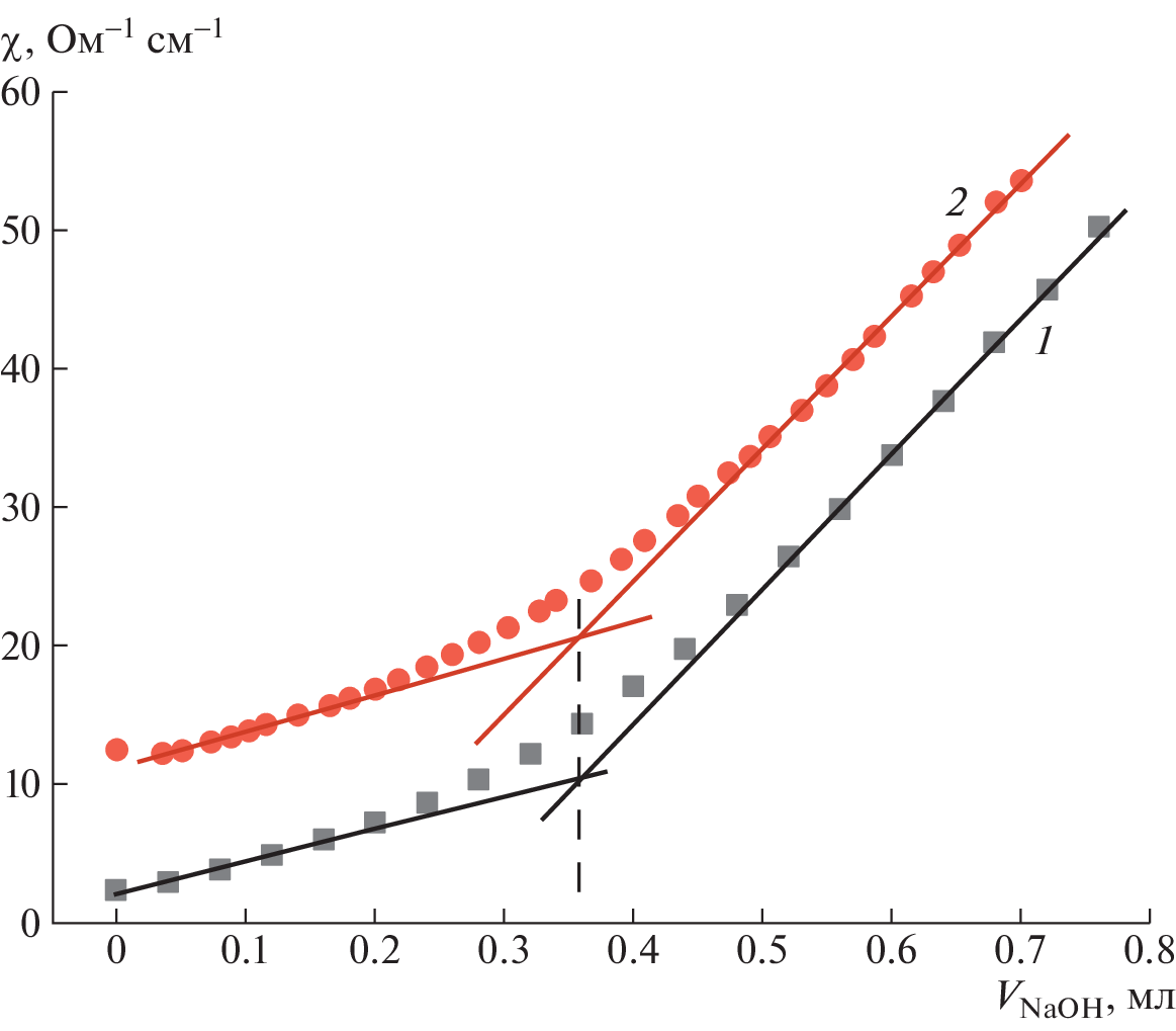 A laboratory procedure has been suggested for determining the concentration of carboxyl groups at the surface of polystyrene microspheres at the latex concentration of a few hundredths of weight percentage (the COOH groups concentration below 4 × 10−4 mol/L). The procedure is based on conductometric and potentiometric titration. The influence of polymer particles concentration in the system, ionic strength of the solution, titration duration, and the system inertness on the obtained values of the carboxyl groups concentration and the determination accuracy have been investigated.