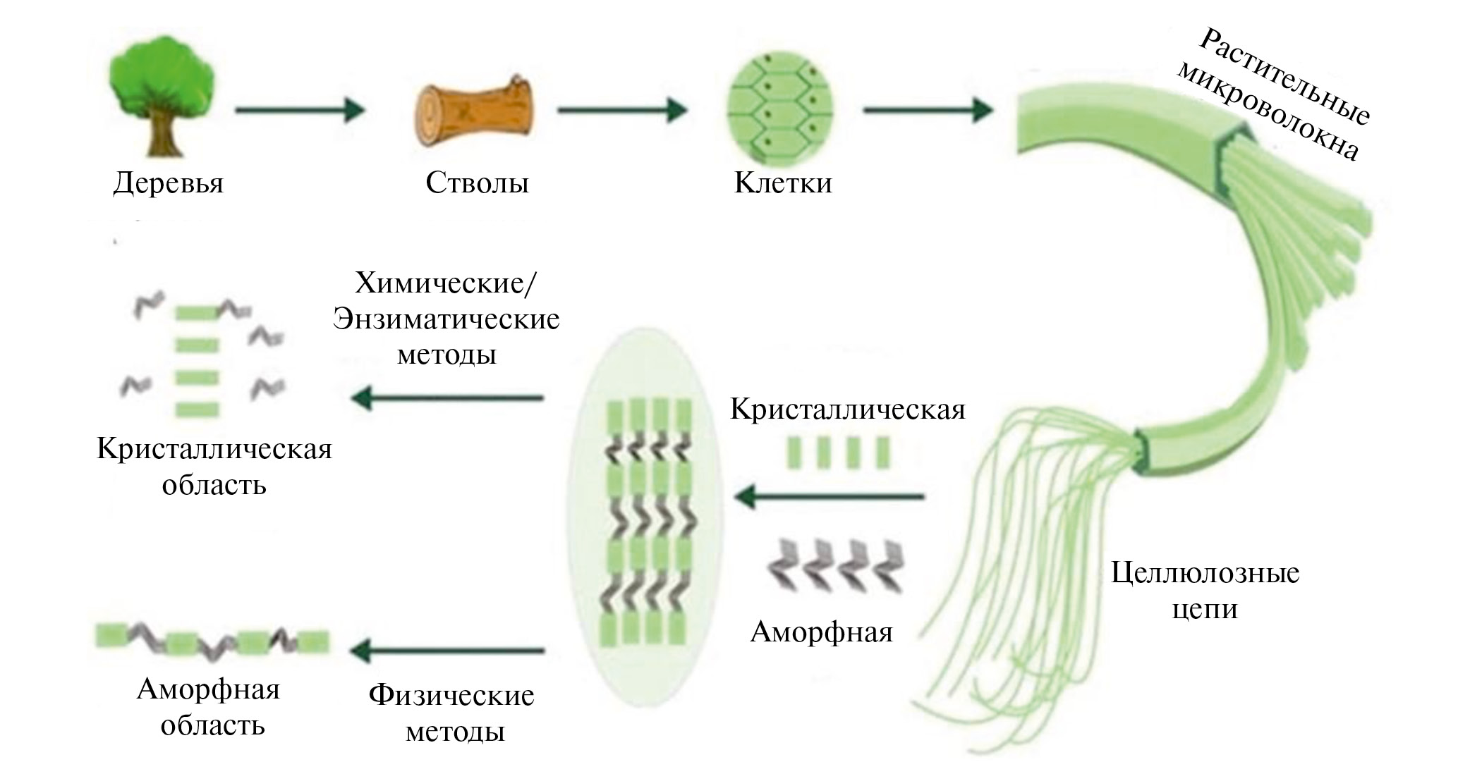 Природная структура данного биополимера состоит из наноразмерных фибрилл и кристаллитов, соединенных первичными и вторичными взаимодействиями. Эти целлюлозные наноструктуры могут быть изолированы вследствие химических, механических, энзиматических, либо комбинированных процессов.