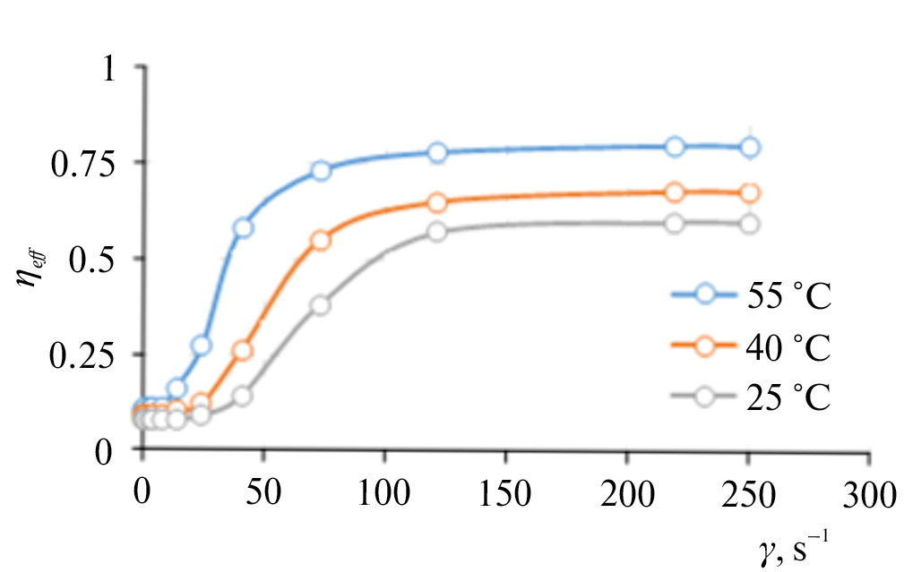 Поведение растворов исследовали в сдвиговом потоке, генерированном в системе коаксиальных цилиндров на приборе “Реометр MCR 92” (“Anton Paar”, Austria) при температуре25, 30, 35, 40, 45, 50 и 55оС. Реологические данные обрабатывали с помощью программного обеспечения RheoCompass. Продольное течение суспензии генерировали в капиллярном вискозиметре Кувшинского.