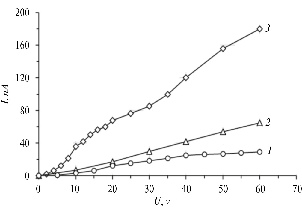 Рис. 7. Зависимость постоянного тока I от напряжения U для нановолокон на основе ПАН (1), композита ПАН : графит = 95 : 5 (2) и 50 : 50 (3).