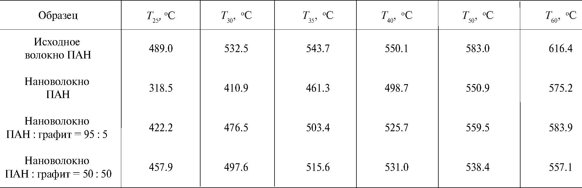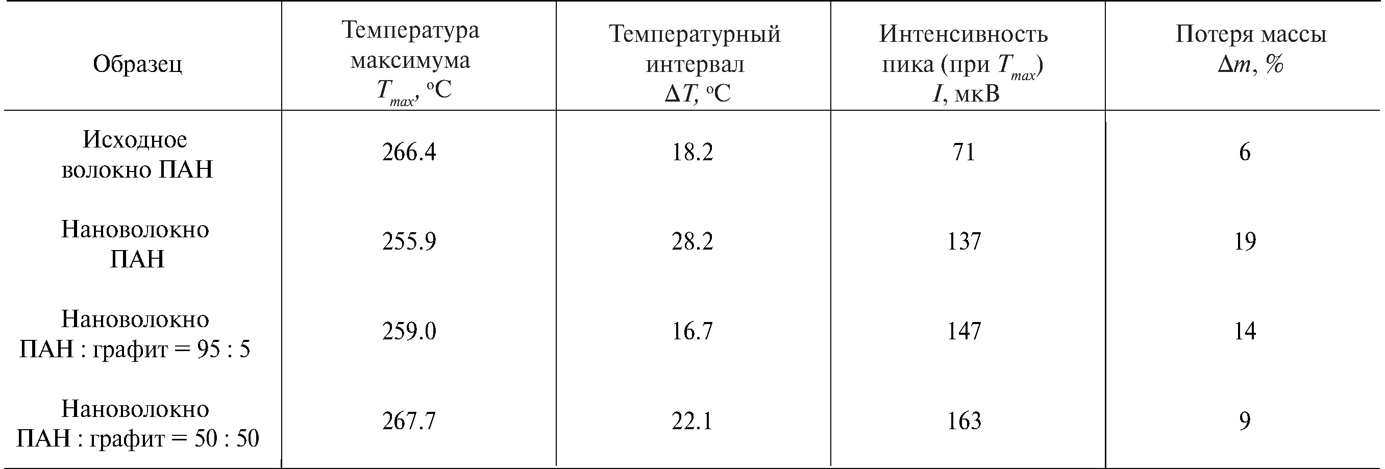 По результатам обработки экспериментальных термограмм в табл. 1 приведены характеристики влияния электропрядения и добавок частиц графита на термическое поведение волокнистого полиакрилонитрильного материала.