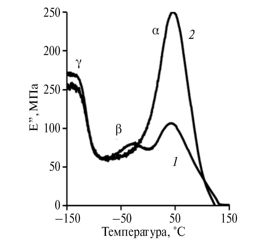Рис. 4. Температурные зависимости E” для чистых сверхвысокомолекулярного ПЭ (1) и низкомолекулярного ПЭВП (2). Пояснения в тексте.