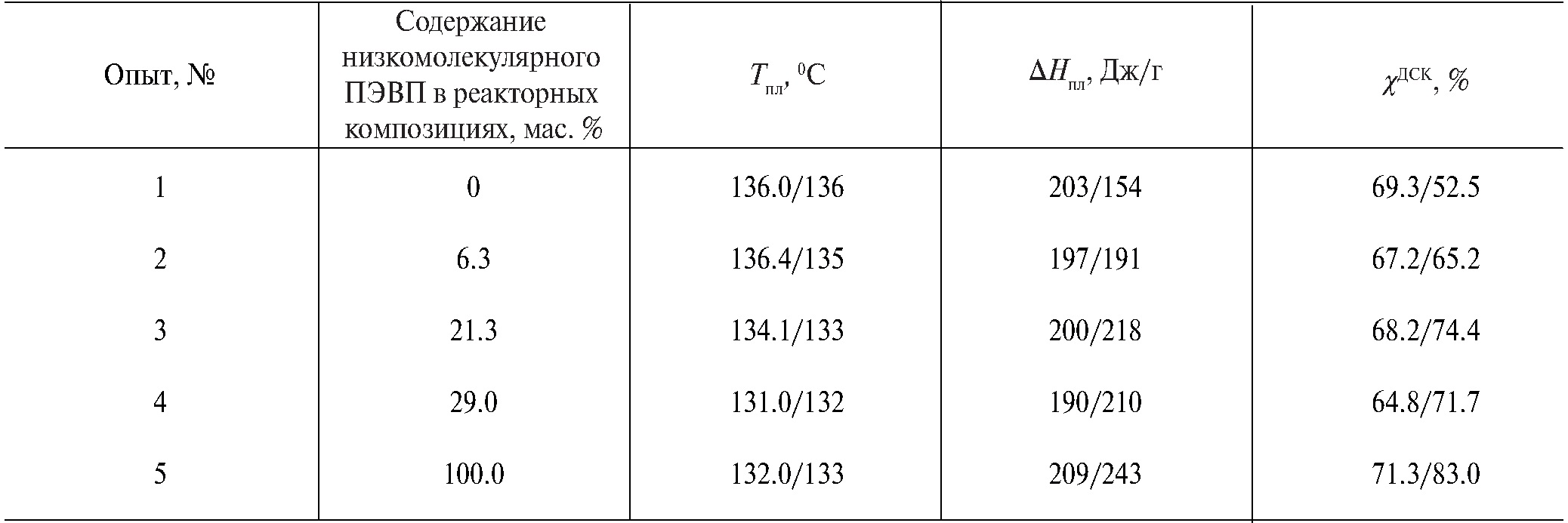Методом ДСК определены тепловые характеристики при втором плавлении (температуры плавления Tпл, энтальпии плавления ΔНпл и степени кристалличности χДСК для сверхвысокомолекулярного ПЭ, низкомолекулярного ПЭВП и композиций сверхвысокомолекулярный ПЭ/низкомолекулярный ПЭВП с различным содержанием низкомолекулярного ПЭВП (табл. 1).