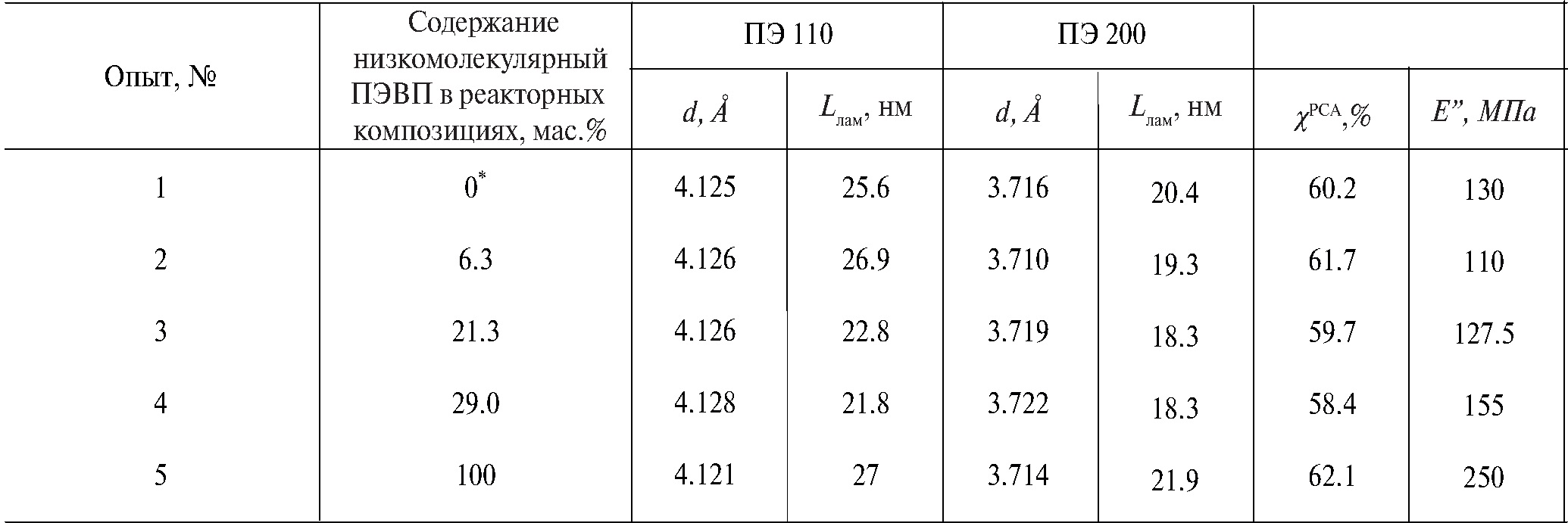 Введение в сверхвысокомолекулярный ПЭ фракции низкомолекулярного ПЭВП приводит к изменению величин E” в интервале от 110 до 155 МПа (табл. 3, опыты 2–4). Можно предположить, что это связано с изменением толщины ламелей в кристаллической фазе композиций сверхвысокомолекулярный ПЭ/низкомолекулярный ПЭВП. Как было отмечено ранее, размеры ламелей, рассчитанные по рефлексам 110 и 200 в низкомолекулярном ПЭВП, превышают эти параметры для сверхвысокомолекулярного ПЭ (табл. 3, опыты 5 и 1 соответственно). Обогащение сверхвысокомолекулярного ПЭ низкомолекулярной фракцией также сопровождается изменением размеров ламелей в реакторных композициях.