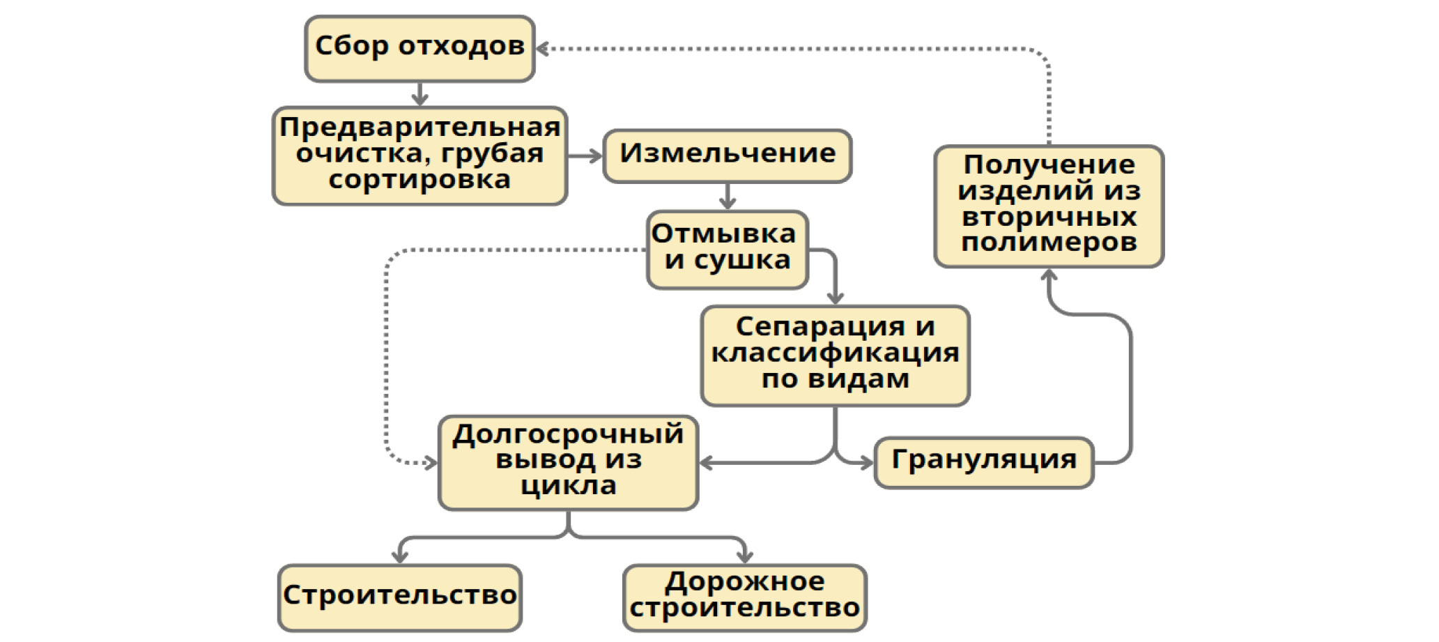 Отходы собираются на полигонах, далее происходит их грубая сортировка (обычно вручную) и предварительная очистка (от этикеток, остатков клея и прочего мусора). После измельчения, отмывки и сушки происходит их сепарация и грануляция. Гранулированные отходы, являющиеся товарной продукцией, используются в производстве различных изделий неответственного назначения. Чаще всего это товары краткосрочного применения, например изделия бытового назначения. После эксплуатации они снова возвращаются в цикл на стадию сбора. В то же время использование измельченных отходов в составе материалов долгосрочного потребления (например, в строительных материалах, в составе дорожной одежды) позволит уменьшить скорость их поступления на свалку, тем самым сократить поток полимерного мусора, поступаемого на пункты его сбора.