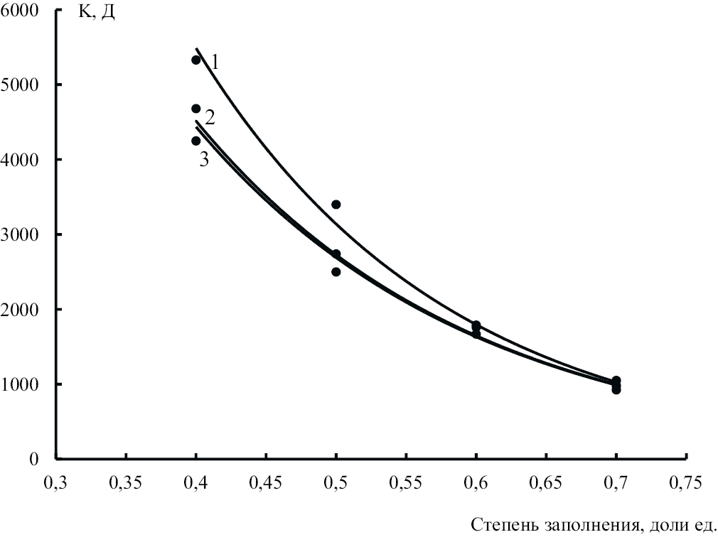 Рис. 3. Зависимость проницаемости материала со структурой порового пространства “гироид” от степени заполнения в направлениях Z (1), X (2) и Y (3).