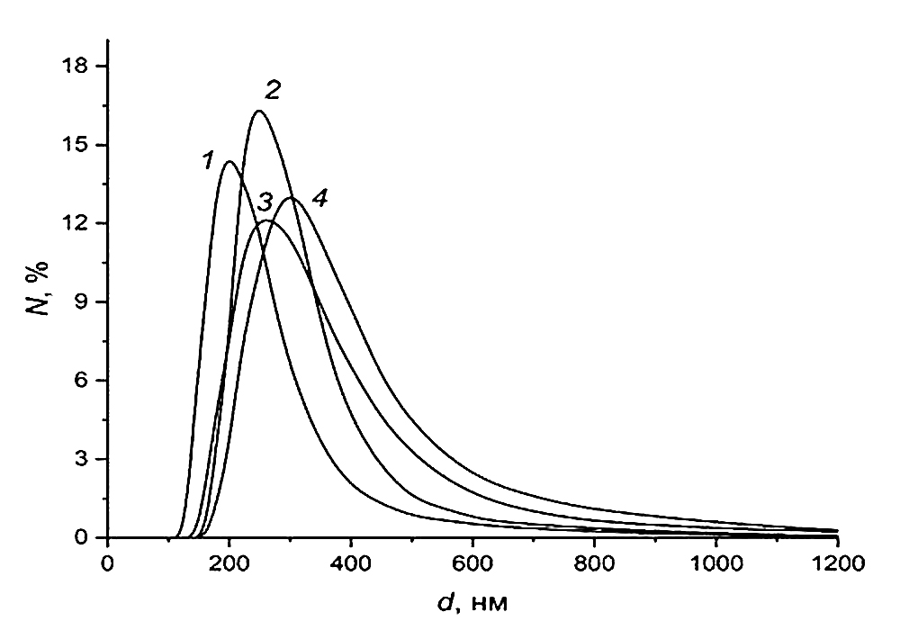 Межмолекулярное взаимодействие пектина и арабиногалактана в растворе подтверждается формированием частиц и изменением характеристической вязкости растворов. Арабиногалактан не образует ассоциатов и частиц в растворе. В растворах пектина и в растворах его смесей с арабиногалактаном присутствуют наноразмерные надмолекулярные частицы (рис. 2). Модальный размер частиц нативного пектина в водном растворе составляет 200 нм при сравнительно узком распределении частиц. Добавление арабиногалактана в раствор пектина и повышение его содержания в полимерной смеси приводит к изменению размерных характеристик частиц в данных системах. В растворе смеси пектин‒арабиногалактан состава 75 : 25 об.% присутствуют частицы с модальным размером 224 нм, а в смеси состава 25 : 75 об.% ‒ частицы с модальным размером 282 нм. При этом с увеличением содержания арабиногалактана в смеси происходит расширение распределения частиц по размерам и повышение содержания частиц с размерами от 300 до 1100 нм, что, по нашему мнению, свидетельствует об образовании интерполимерных комплексов.