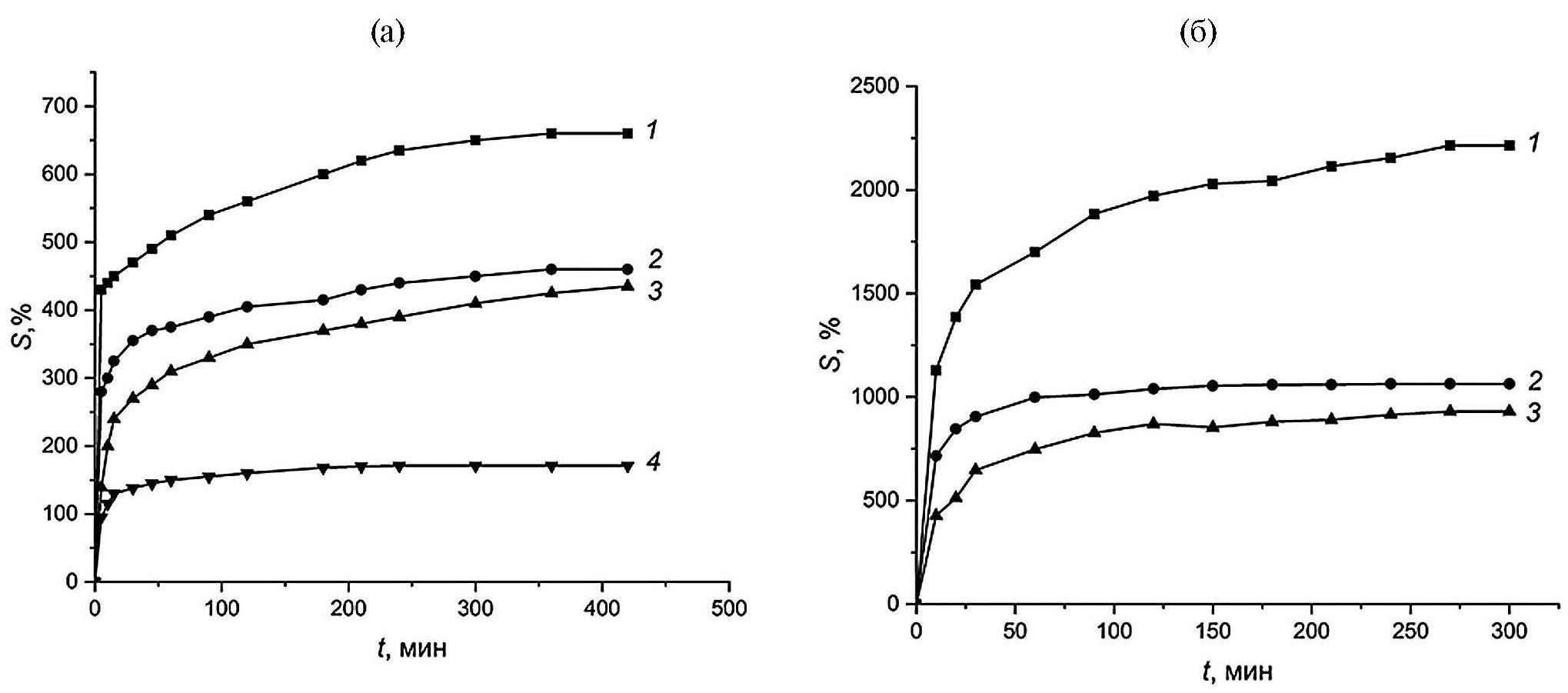 Рис. 5. Кинетические кривые сорбции воды гелями в зависимости от состава (а) и рН среды (б). а: 1 – пектин, 2–4 – пектин : арабиногалактан состава 75 : 25 (2), 50 : 50 (3), 25 : 75 об.% (4), [Са2+] = 0.5 мас.%, рH 7.0; б: рН 9 (1), 6 (2), 4 (3), [пектин : арабиногалактан] = 50 : 50 об.%, [Са2+] = 0.25 мас.%.