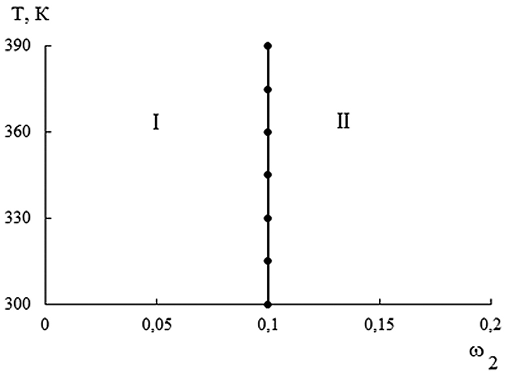 Рис. 2. Фазовая диаграмма системы ГЭЦ–вода/этанол (80/20 мас.ч.) I – область изотропных растворов, II – область анизотропных растворов. ω2 – массовая доля полимера.
