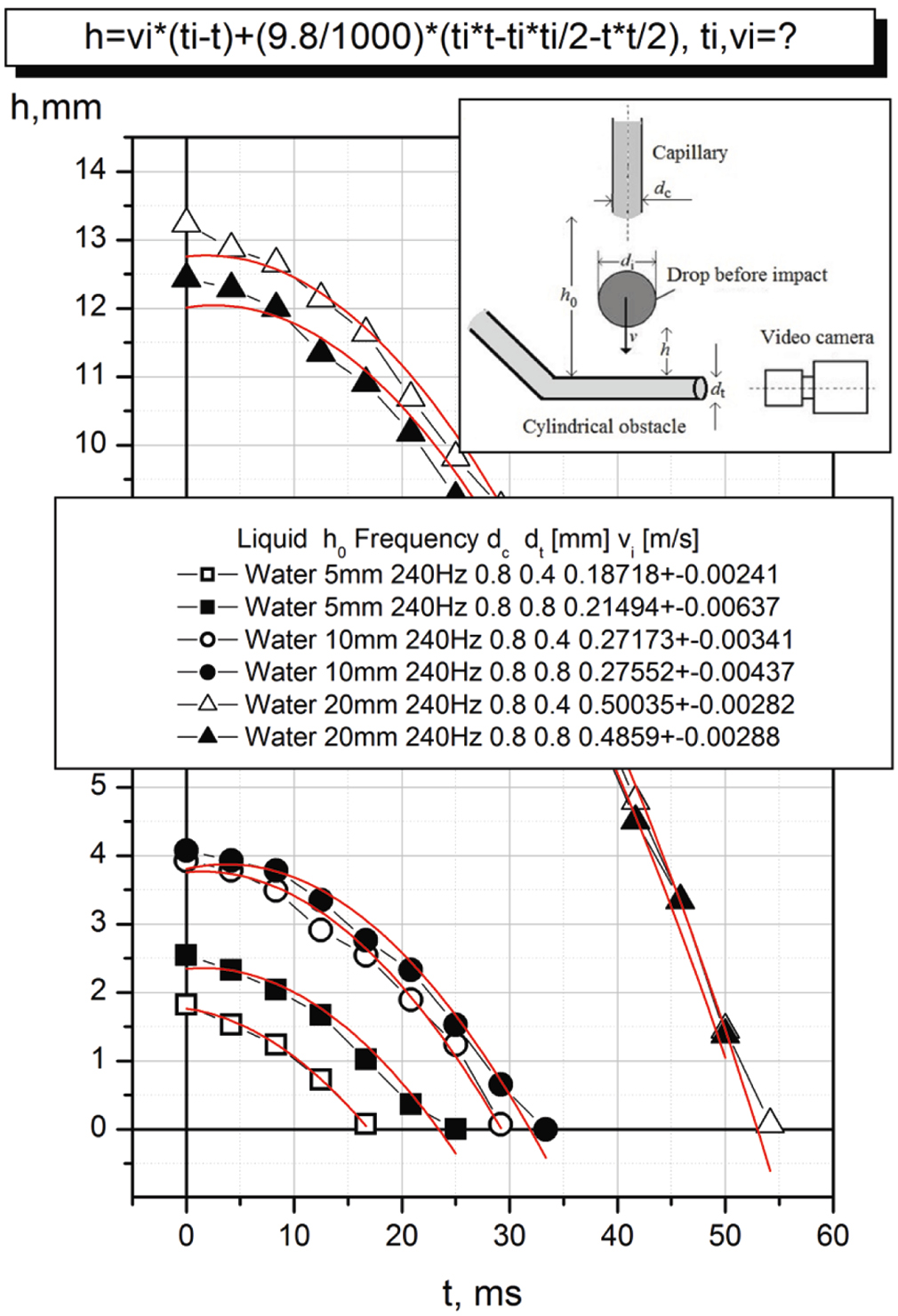 Рис. 2. Зависимость изменения расстояния от капли воды до препятствия h во времени t для разных расстояний между иглами h0. Точкам соответствуют приведенные значения высоты падения капли и диаметра игл dc, dt. Зависимость аппроксимировалась уравнением свободного падения, из которого вытекает расчетная формула, показанная на графике. В рамках пакета “Origin 6.1” находились значения ti – время падения капли и vi ± ∆vi – скорость удара и точность ее определения. Столкновения происходили при скорости 0.2-0.5 м/c.