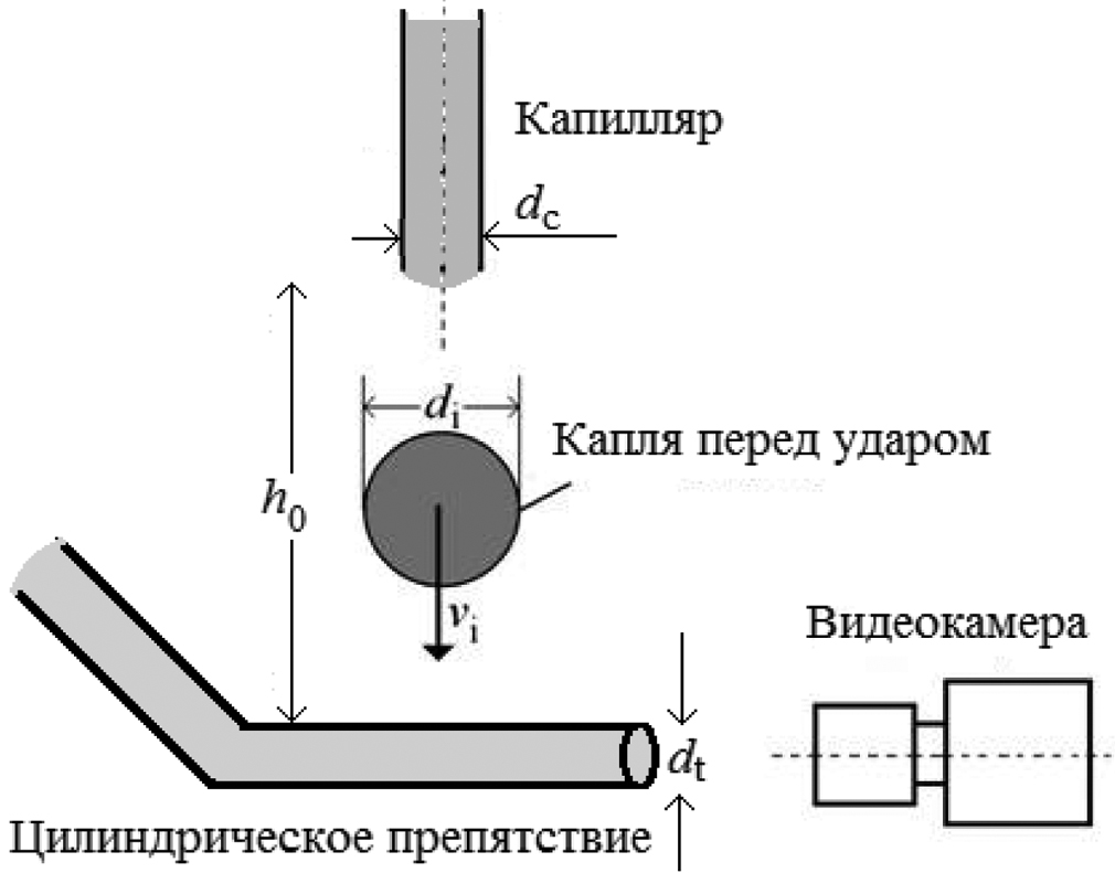 Первоначально капля жидкости образовывалась на конце капилляра, функцию которого выполняла инъекционная игла с внешним диаметром dc = 0.8 мм. Жидкость медленно формировала каплю с помощью инфузионного насоса “SINO SN-50C6”. При достижении определенной массы капля отрывалась от капилляра [20]. Далее капля сталкивалась с поперечно расположенным цилиндрическим препятствием, которым служила другая инъекционная игла диаметром dc = 0.4 или 0.8 мм. Для повышения контрастности и удаления из поля съемки посторонних объектов иглу согнули примерно под прямым углом так, чтобы на видеокадрах были видны только капля и торец иглы (см. схему и фото). В опытах расстояние от среза верхней иглы до боковой поверхности нижней иглы составляло h0 ~ 5, 10 и 20 мм. Процесс столкновения регистрировали при помощи видеозаписи с частотой кадров f = 240 и 960 Гц. Смартфоны “iPhone 6” (240 Гц) и “Honor 30S (CDY-NX9A)” (960 Гц) применяли для видеозаписи.