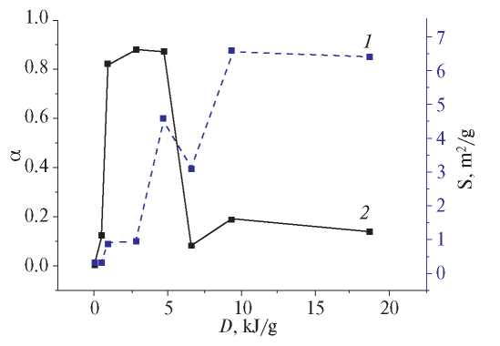 Рис. 1. Зависимость удельной поверхности реакционной смеси (1) и степени превращения (2) от дозы активации.