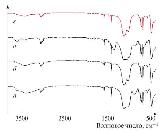 Рис. 2. ИК-спектры исходного ПФССО (а) и полиборфенилсилоксанов, полученных при 0.5 (б), 3 (в) и 7 (г) мин активации.