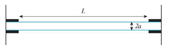 Рис. 1. Нить полимерного геля длины L и радиуса a (L >> a) которая предварительно растянута и фиксирована за концы. Цветные рисунки можно посмотреть в электронной версии.