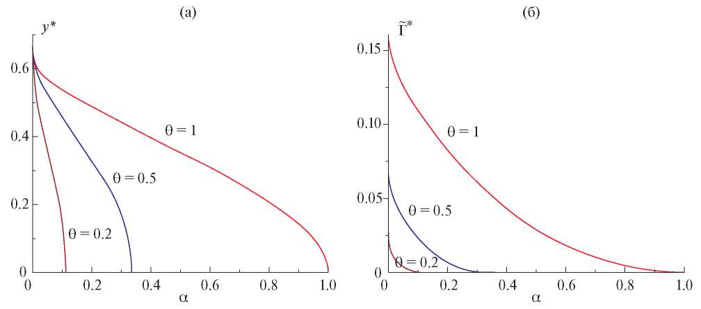 Оно определяет значения x и в точке стагнации (Γ = 0). Интересно отметить, что при α → 0 из уравнения (38) получаем yst → 1 для любого θ. Напротив, при α → ∞ в точке стагнации x = y, и обе величины зависят от θ при θ > 2: y = yst (θ) увеличивается с ростом θ от y = 0 при θ = 2 до y → 1 при θ → ∞ (рис. 4).