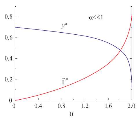 Графики зависимости критического приведенного волнового вектора y* и приведенной скорости роста от при α << 1 показаны на рис. 3. Период Λ наиболее быстрорастущей моды θ стремится к бесконечности при θ → 2: , если 2 − θ << 1, что соответствует . Приведенная скорость роста всегда увеличивается с ростом θ и стремится к значению при θ → 2. В другом предельном случае θ << 1 и α → 0 период возмущений Λ остается сравним с радиусом нити a0: Λ* ≈ 9.015a0 (y* = 0.697), в то время, как пропорционален θ, , что неудивительно, учитывая, что θ пропорционально поверхностному натяжению, которое является основной движущей силой неустойчивости. Интересно отметить, что абсолютная скорость роста здесь равна