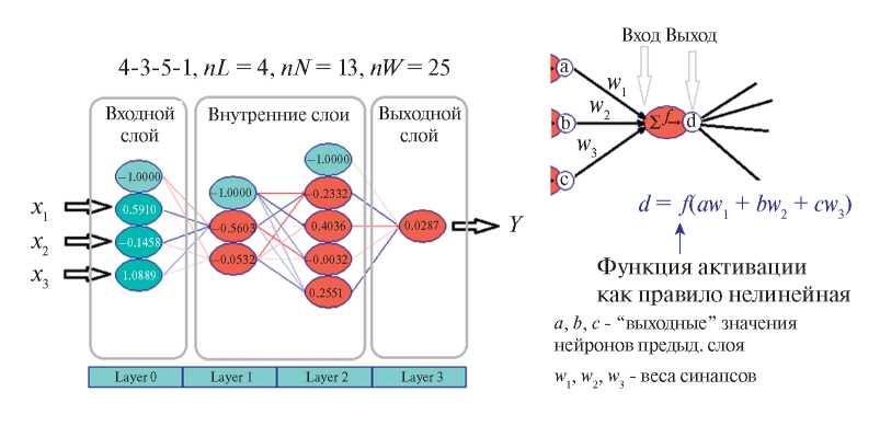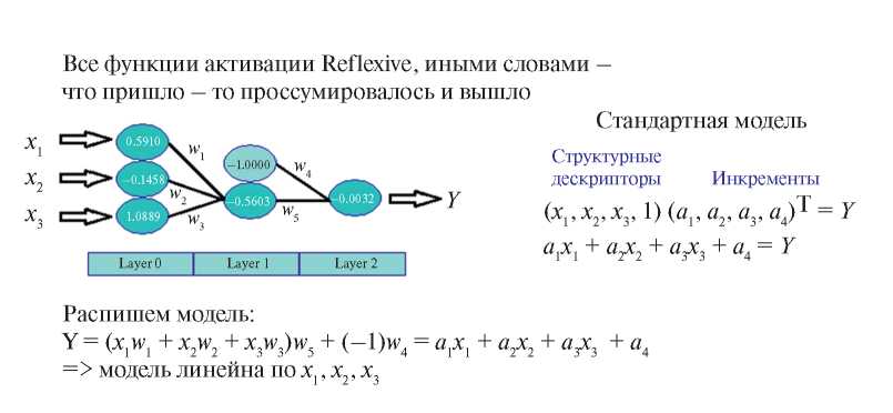 Рис. 2. Математическая тождественность линейной модели и нейронной сети с рефлексивными функциями активации (для простоты рассматривается нейронная сеть только с тремя входными значениями).