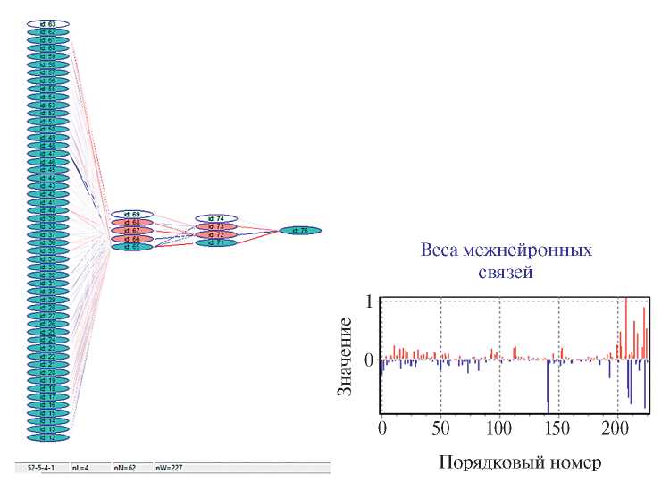 Параметры этой нейросетевой модели приведены на рис. 3б. Видно, что параметры находятся в приемлемом диапазоне (от –1.0 до +1.0), т.е. модель способна к активному дальнейшему обучению, и при необходимости может быть дообучена. С другой стороны рис. 3б показывает, что модель близка к сбалансированной, так как количество положительных параметров примерно равно количеству отрицательных, и отсутствуют отдельные резко выделяющиеся (на несколько единиц) параметры, т.е. не существует явно доминирующих нейронов. Следовательно, количество незначимых для модели параметров является малым.