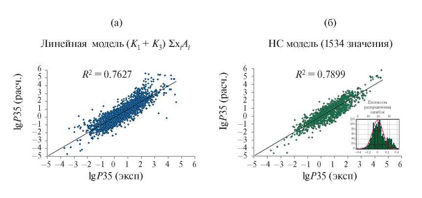 Рис. 8. Сравнение экспериментальных и расчетных значений lgP35 [Баррер] для линейной (а) и нейросетевой (б) моделей.