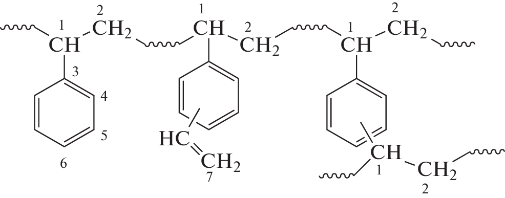 Branched polystyrenes are synthesized by the radical copolymerization of styrene and divinylbenzene with reversible inhibition (in the presence of 2,2,6,6-tetramethylpiperidine-1-oxyl) under deteriorating thermodynamic quality of the solvent. The resulting polymers are studied by size-exclusion chromatography combined with static light scattering, ozonolysis, NMR spectroscopy, and differential scanning calorimetry. The branched polymers synthesized by living radical polymerization are characterized by lower intrinsic viscosity values than their linear analogs. Kuhn–Mark–Houwink parameters for these polymers in a tetrahydrofuran solution (а = 0.29) confirm the nonlinear architecture of macromolecules and a high content of pendant double bonds comparable in the order of magnitude with their theoretical content in the absence of the cyclization reaction indicate their branched structure. The glass transition temperature of the branched polystyrenes is 20–35°С lower than the glass transition temperature of the linear polystyrene.