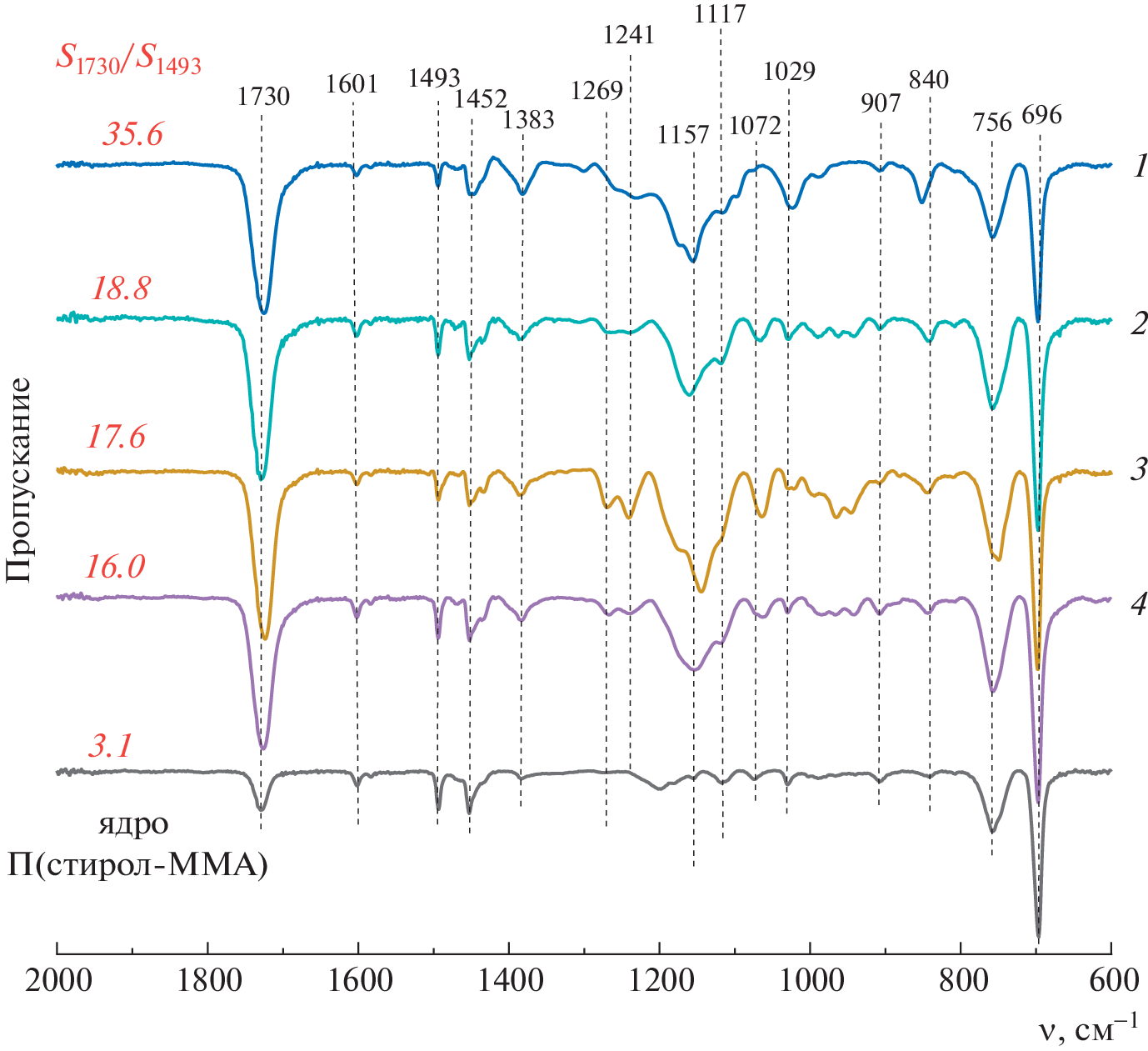 Submicron composite particles with the core/shell structure are synthesized by the seeded emulsion polymerization of a mixture of various acrylates in the presence of a redox initiation system. The diameter, morphology, and surface structure of particles as well as their ability to self-assemble into 3D ordered thin-film structures are studied by scanning electron microscopy, FTIR spectroscopy, thermogravimetry, and dynamic light scattering. It is shown that under the used experimental conditions particles with a shell thickness of 10‒35 nm are synthesized. The effect of shell composition (in particular, the alkyl chain length of acrylate comonomers) on the morphology and structure of the surface layer of the obtained composite particles is traced.