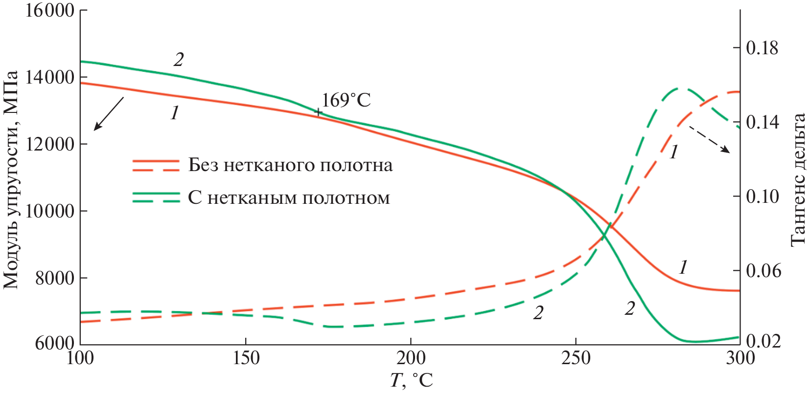 The effect of introduction of polyamide nonwoven materials on the thermal and mechanical properties of polymer composite materials based on phthalonitriles and a carbon fabric is studied. It is shown that the addition of 3 wt % of polyamide nonwoven material causes a 44% increase in the specific work of delamination. At room temperature elastic mechanical characteristics, such as compressive strength and compressive modulus, for the composite modified with the nonwoven material increase by 12 and 100%, respectively. According to dynamic mechanical analysis, upon reaching 169°C the melting of polyamide occurs; however, there remains the possibility to use the composites above this temperature, as confirmed by mechanical tests performed at 200°C.