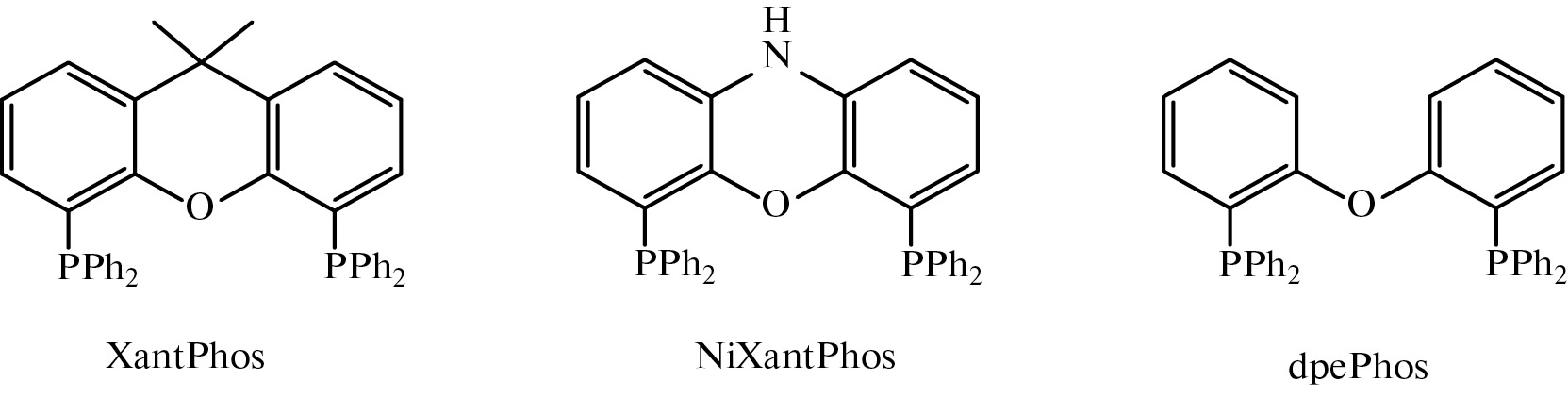 Близкими аналогами подобных соединений являются так называемые P‒O‒P-лиганды, широко используемые в координационной химии и металлокомплексном катализе, например, 9,9-диметил-4,5-бис-(дифенилфосфино)ксантен (XantPhos) [25], 4,6-бис-(дифенилфосфино) феноксазин (NiXantPhos), бис-(2-(дифенилфосфино)фениловый) эфир (dpePhos):