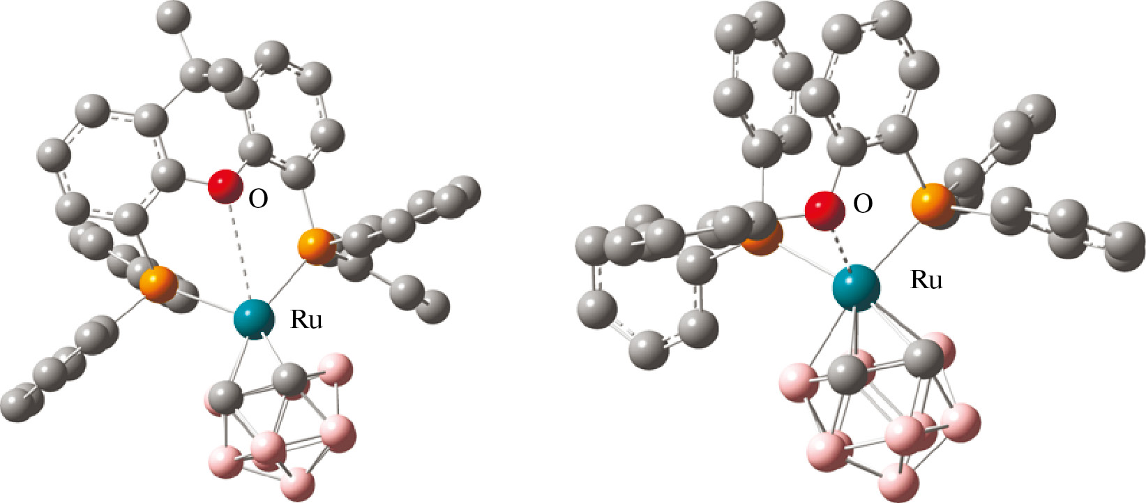 Наблюдаемое различие в процессах полимеризации, протекающей в присутствии соединений 1–4 с одной стороны и 5–6 с другой, может свидетельствовать о различии в механизмах взаимодействия комплексов со спящими цепями или радикалами роста. Для объяснения данного факта было проведено квантово-химическое моделирование процесса, отображенного на схеме 2, в рамках теории функционала плотности. В частности, были оптимизированы структуры 16-электронных интермедиатов, образующихся из исследуемых комплексов в результате отрыва атомов галогена. Ниже приведены оптимизированные геометрии соответствующих частиц 1а и 5а, содержащих в своей структуре XantPhos и dpePhos соответственно.