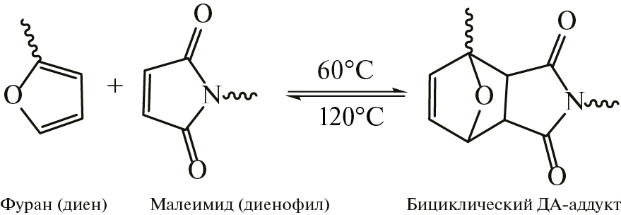 Она представляет собой термически индуцируемое [4+2] циклоприсоединение с участием диена и диенофила [14–17]. В качестве таковых чаще всего применяются фураны (диен) и малеимиды (диенофил). ДА-реакция, образуя бициклический аддукт (ДА-аддукт), и обратная ДА-реакция (оДА-реакция) находятся в термодинамическом равновесии, которое зависит от температуры. При высоких температурах (как правило 110–130 °C) преобладает оДА-реакция, и равновесие смещено в сторону исходных соединений, а при более низких (30–60 °C) – в сторону ДА-аддукта [14]. Существуют многочисленные исследования по тематике как образования по ДА-реакции термически обратимых ковалентных сеток из мономеров, так и сетчатых полимеров, содержащих соответствующие боковые функциональные группы [9, 18–22].